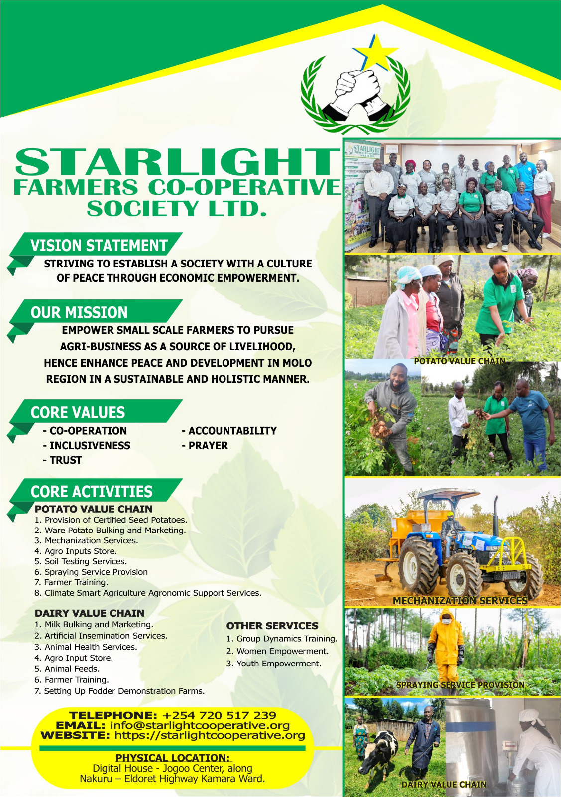 Starlight Farmers’ Co-operative Society is a farmer led and farmer owned primary cooperative registered on 11th June, 2014 under the office of the Commissioner of Cooperatives, located in Kuresoi North Sub-County, Nakuru County in Kenya.